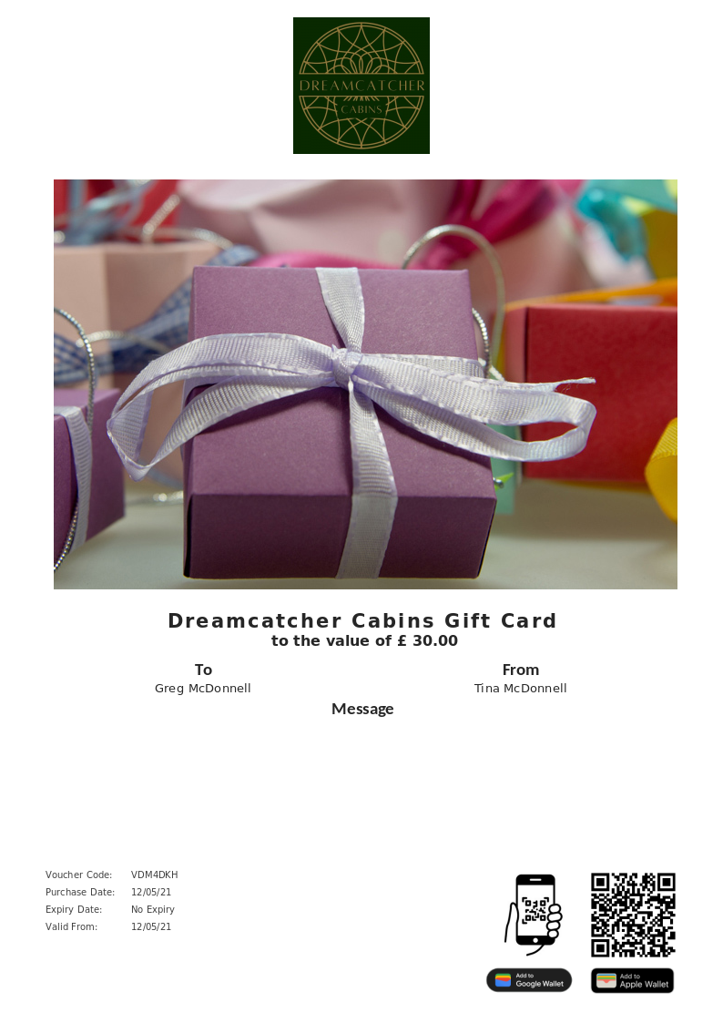 Dreamcatcher Cabins allows you to purchase instantly printable gift vouchers, special offers and tickets using the Voucher Connect platform.
